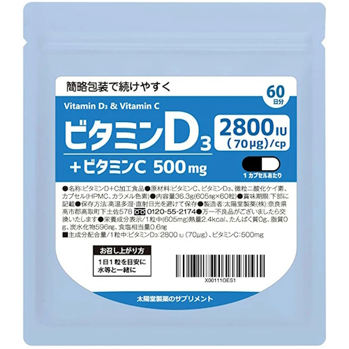 Это пищевая добавка, содержащая витамин D₃ и витамин C. Витамин D₃ содержится в количестве 2800 IU (70 мкг) на одну капсулу, а витамина C — 500 мг.